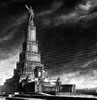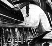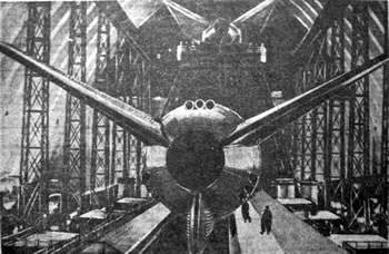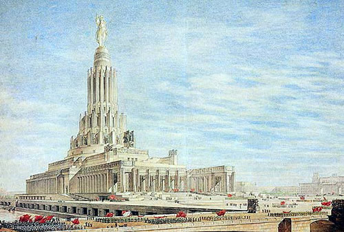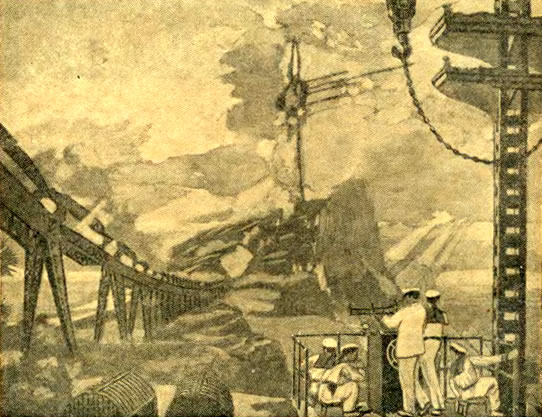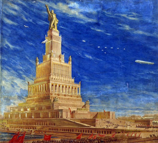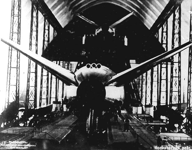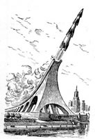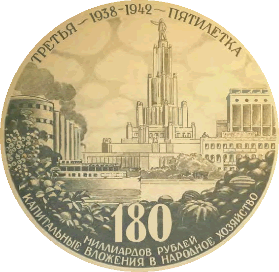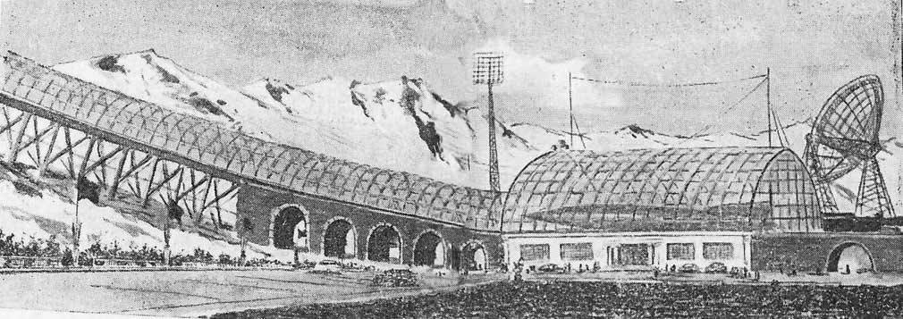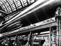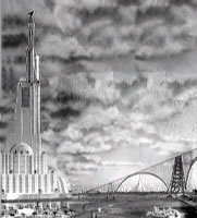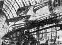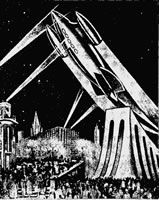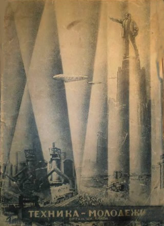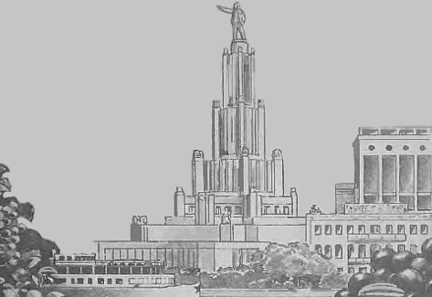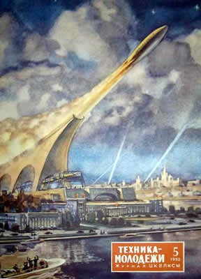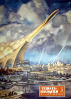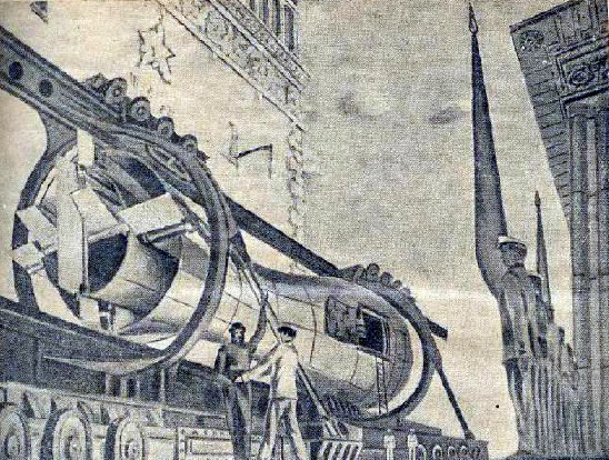 ![]() La ville de Moscou dans le futur a été construite sur un plateau de tournage de 200 mètres carrés par les décorateurs du film, après consultation de Vadim Petrovich Ryndine (В. Ф. Рындин), célèbre peintre et décorateur de théâtre (tel le Bolchoï), qui entrera à l'Académie des Beaux-Arts russe. Zhuravlev n'avait pas limité sa recherche d'exactitude scientifique à la description de la fusée, mais il avait élargi cette exigence à tous les aspects du film : intérieur des bâtiments, instruments, et pour finir un impressionnant travail de création et de maquettisme afin d'imaginer la ville de Moscou telle qu'elle serait en 1946. Nota : initialement l'action devait se dérouler en 1950 ainsi que l'avait expliqué Zhuravlev dans la Komsomolskaïa Pravda du 24 mai 1934. Le scénario du film décrivait Sedhyk, un ancien ouvrier et soldat de la révolution russe. En 1920, il avait repris des études et avait obtenu finalement le titre d'académicien. Passionné d'astrophysique il s'était centré sur la problématique des voyages interplanétaires. Le film décrivait donc le parcours de 30 années de ce scientifique et la réussite à laquelle le pays lui permettait d'accéder. L'année 1946 fut retenue par la suite dans la volonté de démontrer ce que le pays communiste était capable de faire dans le temps des dix années correspondant à deux plans quinquennaux.