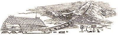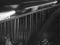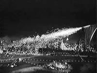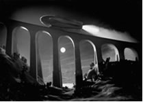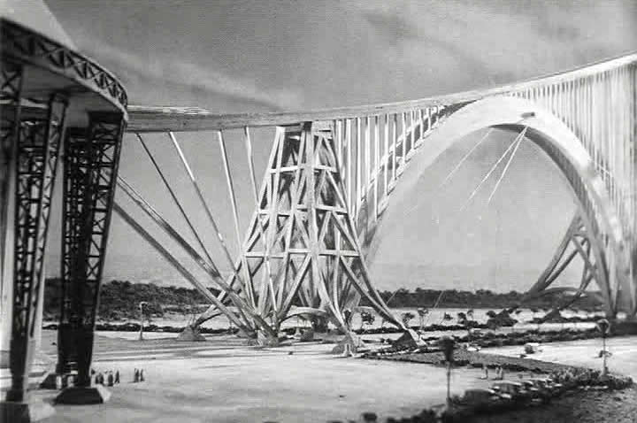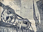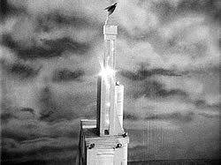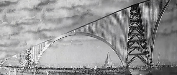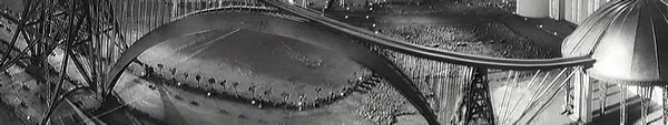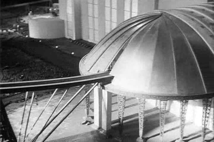 ![]() Sur cette scène composée à partir de plusieurs images du film, ce qui donne une fausse impression de courbe de la rampe qui est en fait rectiligne, on peut constater qu'elle commence directement à l'intérieur du bâtiment principal, celui de l'Institut à droite de l'image, et qu'ensuite elle passe au-dessus de la ville, de ses arbres et ses avenues. Pour cette séquence de travelling au cours de la vingtième minute du film tous les véhicules circulent, indiquant une nouvelle fois une animation image par image de très bonne qualité. |