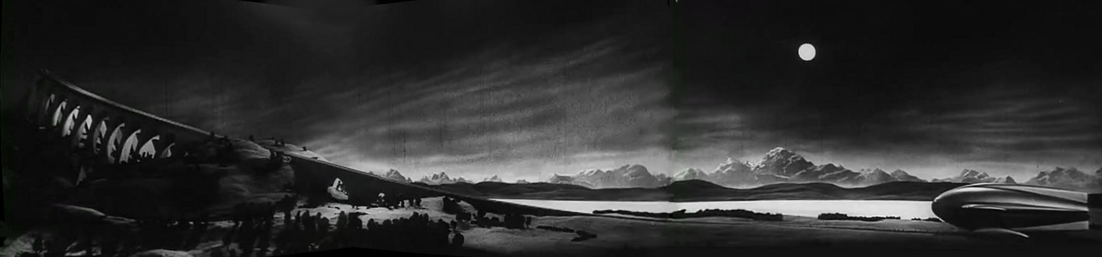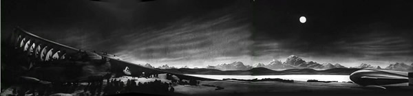 écrivait : “[...] Dans certains cas, l'effet réaliste est également obtenu par un écart significatif par rapport à vitesse normale du film. 6 images par seconde, le spectateur verra à l'écran des nuages se déplaçant rapidement, semblables aux nuages filmés lors d'une tempête. Pour le film Kосмический рейс, nous devions filmer un vaisseau interplanétaire actif -astroplane- depuis un viaduc. Il fallait montrer la particularité inhabituelle et fantastique du vol. La prise de vue a été réalisée sur un modèle d'astroplane en taille 1/20e. Il s'est avéré qu'il était impossible de donner à la maquette la vitesse de décollage élevée nécessaire sans recourir à des dispositifs mécaniques complexes. Un essai de film au ralenti a été réalisé avec une fréquence de 12 images par seconde, alors qu'une fréquence d'au moins 100 images par seconde est nécessaire pour filmer une maquette au 1/20e (voir le chapitre sur la prise de vue des maquettes). Le décollage de l'astroplane s'est bien déroulé à l'écran. La raison de ce succès inattendu est que l'astroplane, glissant doucement le long du tablier, n'a eu qu'un mouvement vers l'avant sans mouvements latéraux : oscillations, secousses, etc. On peut en conclure que tout ralentissement de la prise de vue est un effet réaliste souhaitable de l'accélération dans le cas où l'on filme un objet en mouvement uniforme, dépourvu de mouvements latéraux liés à l'influence de la gravité terrestre.” |