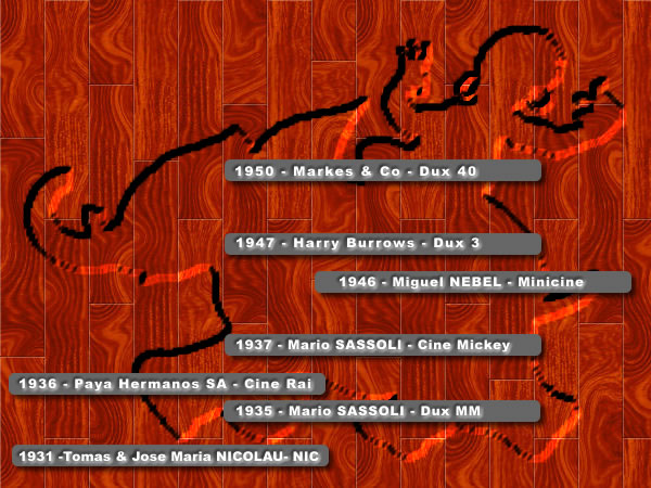 - d'un personnage dessiné connu (ici le Mickey (Topolino) de Walt Disney, en Allemagne le Dux se parera d'une Betty Boop stylisée, aux Etats-Unis ce sera le Mickey Mouse Movie Jecktor) - la technologie du Nic espagnol reprise sous la forme de la trompe de l'éléphant blanc de la marque des frères Nicolau ! |